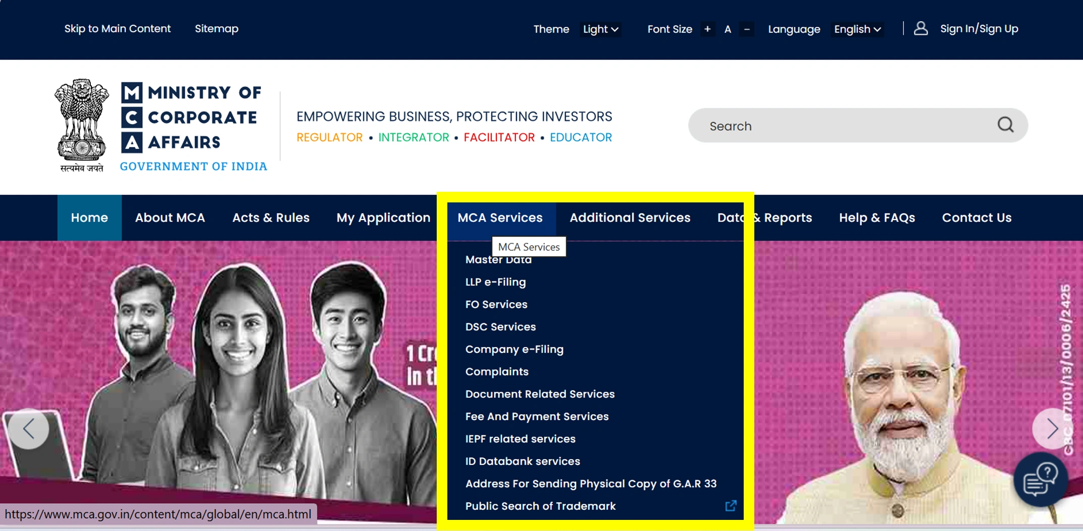 Step 2: On the homepage, look for the ‘MCA Services’ tab in the top navigation bar. Hover over it to reveal a dropdown menu.