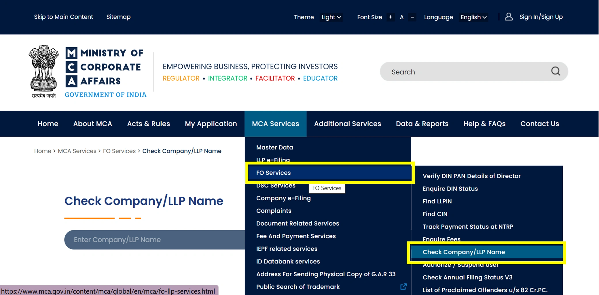 Step 3: Under the ‘FO Service’ category in the dropdown, click on ‘Check Company Name/LLP Name’. This will open a search interface where you can input your desired name.