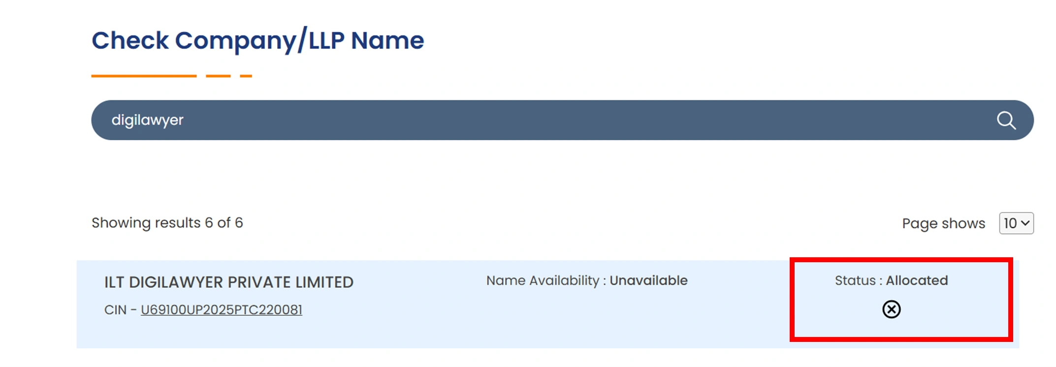 When you apply for name approval (via SPICe+ Part A), the MCA system checks existing company and LLP names.