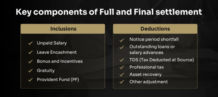 A Full and Final Settlement is the final, comprehensive settlement between the employer and employee when the employment ends. It includes paying pending salary, bonus, gratuity, and unused leave encashment, while deducting any amount that the employee owes to the company.
