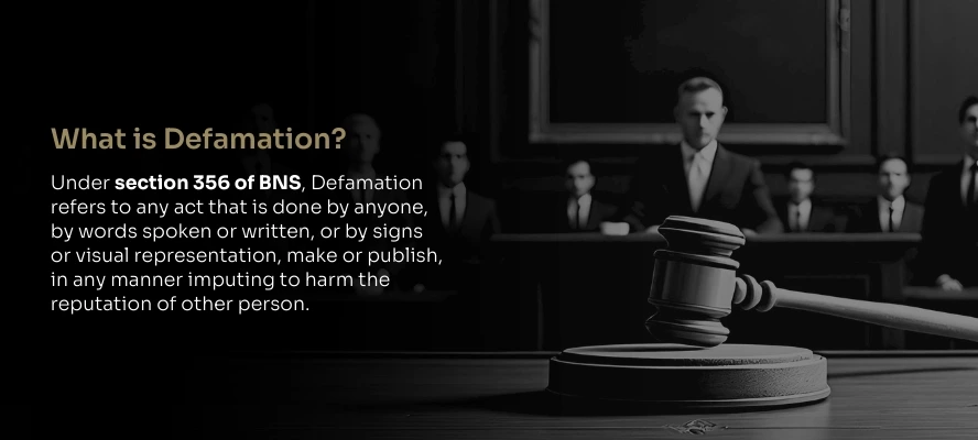 Under section 356 of BNS, Defamation refers to any act that is done by anyone, by words spoken or written, or by signs or visual representation, make or publish, in any manner imputing to harm the reputation of other person.