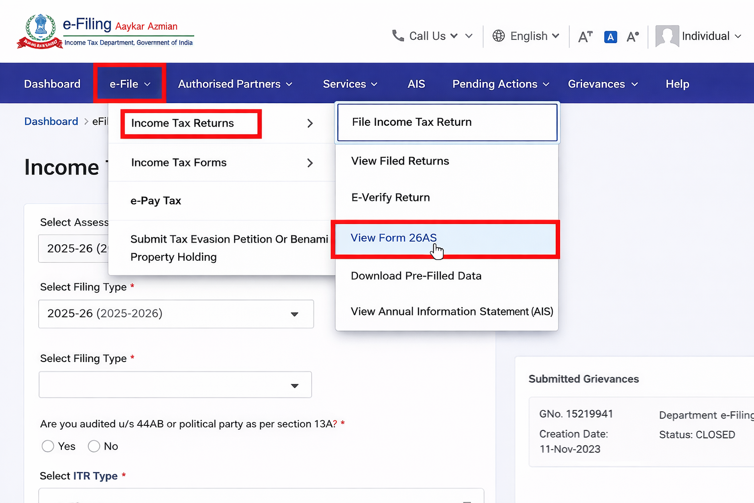 Form 26AS | To verify TDS deposited | IT E-filing Portal |