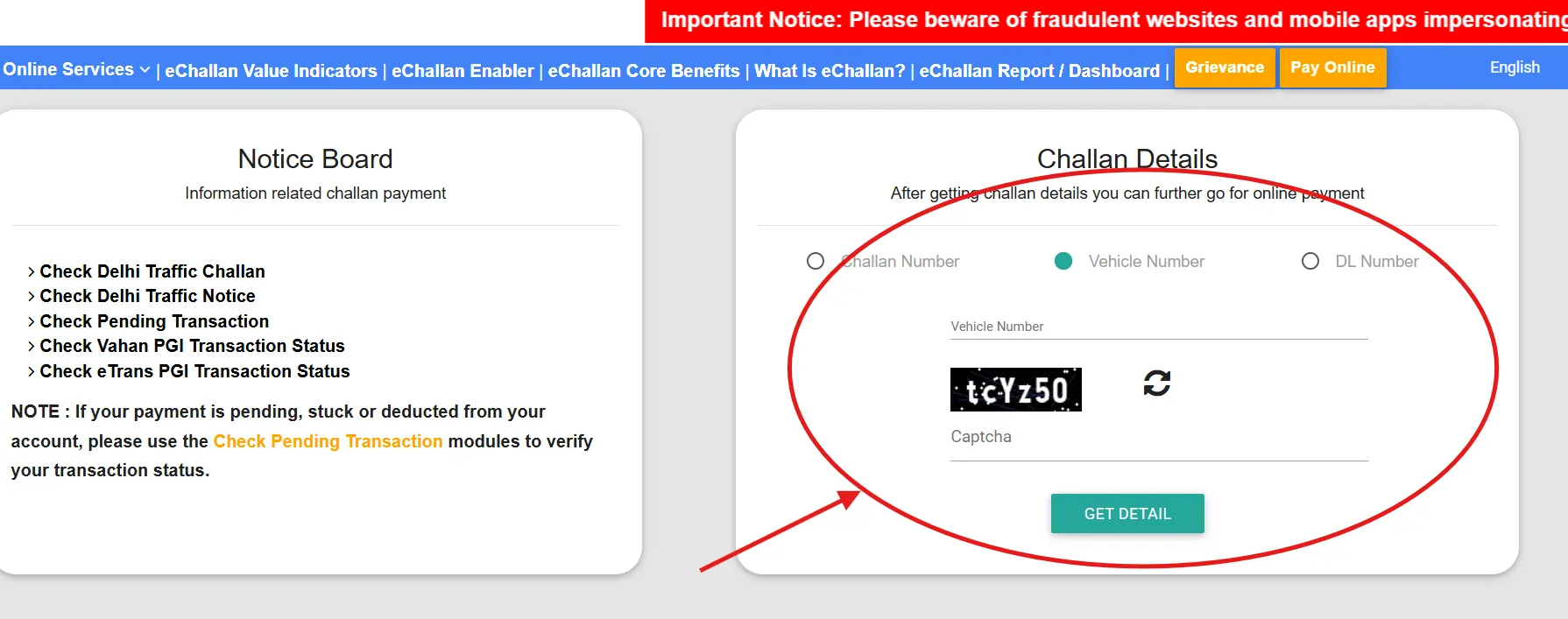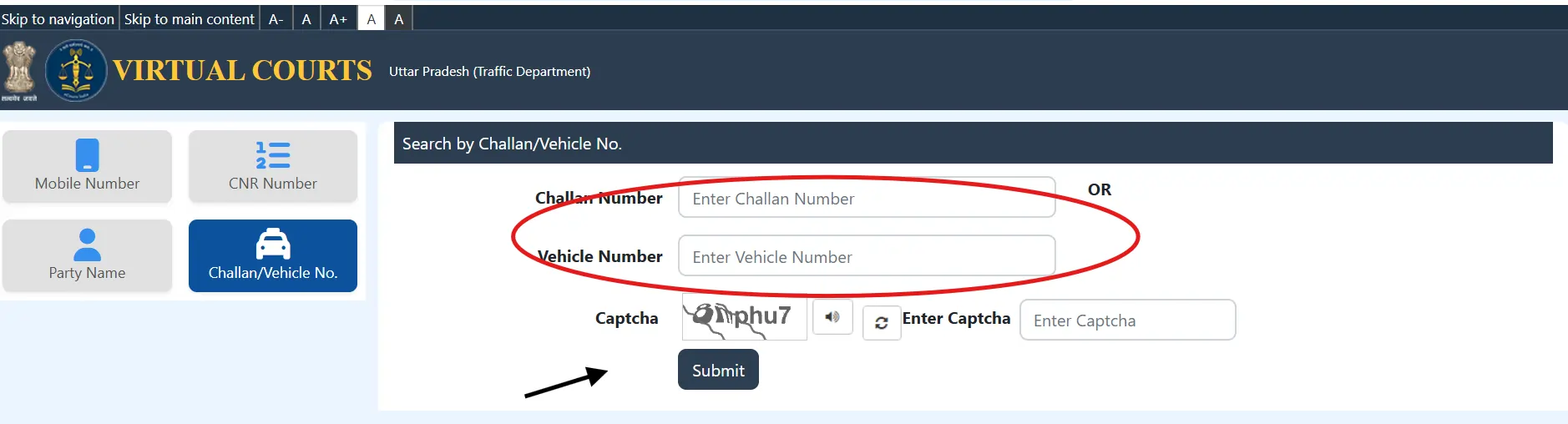 Go to the UP Traffic Police official website or the Parivahan e-challan portal. Enter your vehicle number.
