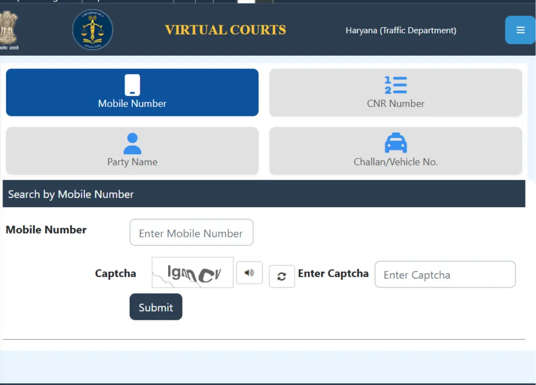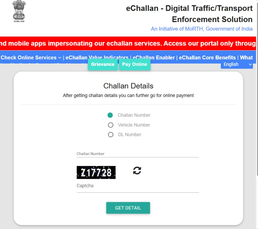 Step 1 – You can visit the website of Parivahan Sewa or the Haryana Police e- challan portal. Enter your vehicle number or challan number. Check whether your challan is pending, sent to court, eligible for Lok Adalat, or already paid.